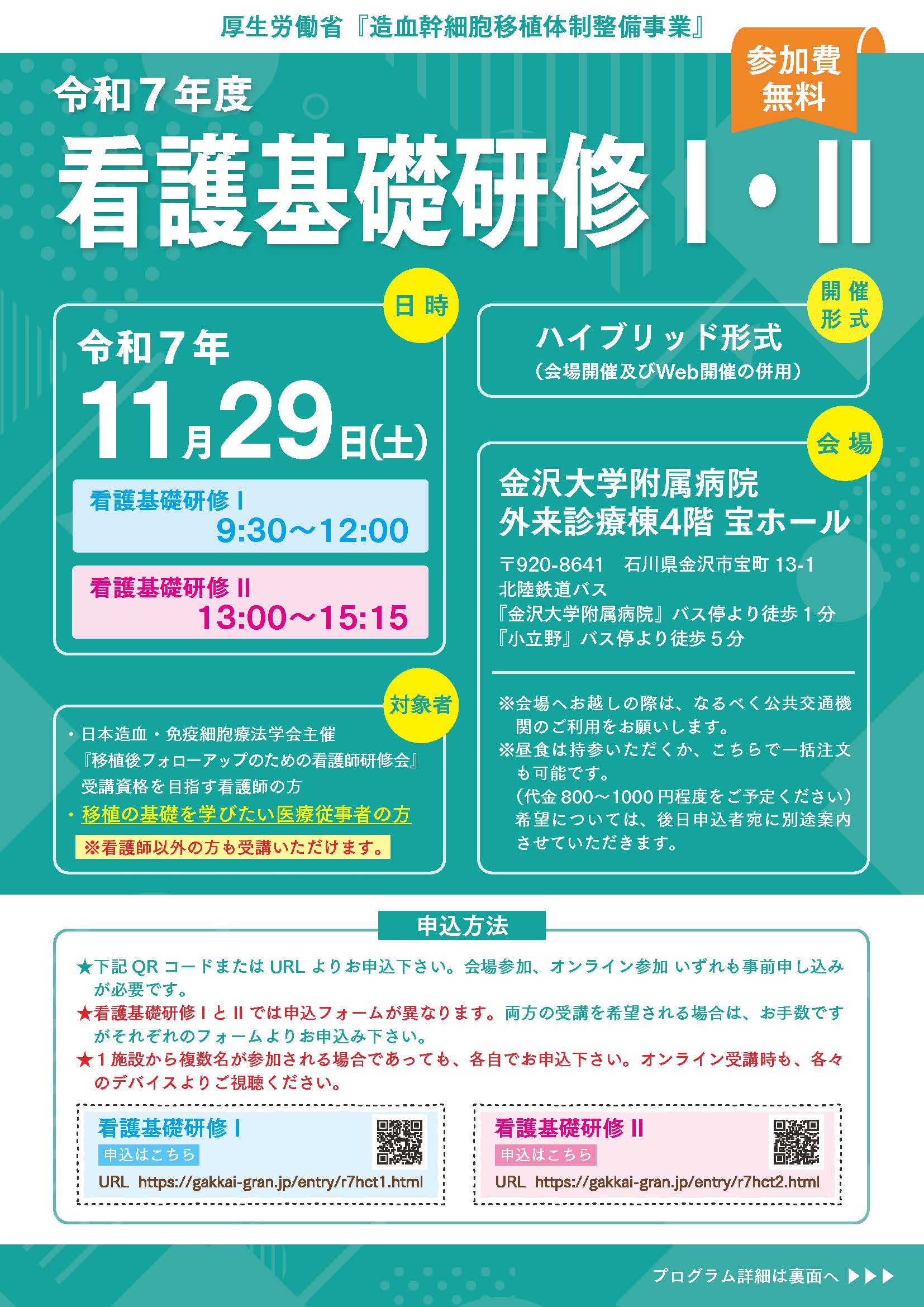 | 令和7年度 造血細胞移植看護基礎研修会Ⅰ・Ⅱ | |